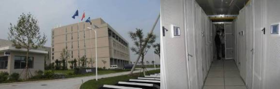 仓储式机房天津试点工程项目属于实验机房,设置于中国移动华北大区天津公司物流中心。在2#仓库东南角改建约500㎡的仓储式机房,机房内设置两层货架,总高度为6.6米,包括电力、电池两个模块和四个IT模块。四个IT模块分别设置平均功率为15kW/机架、15kW/机架、10kW/机架和5kW/机架的服务器。